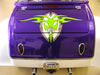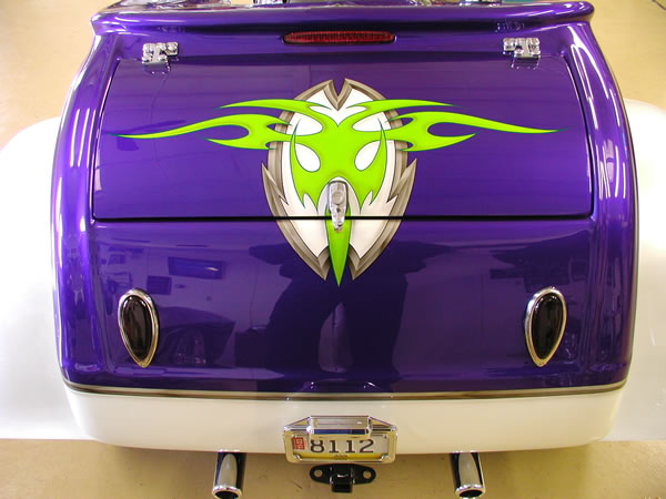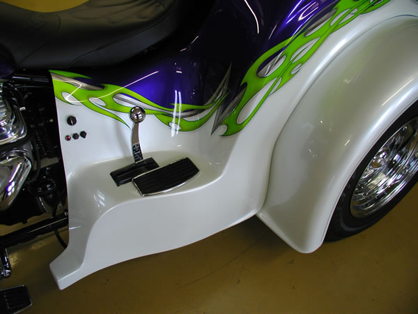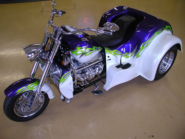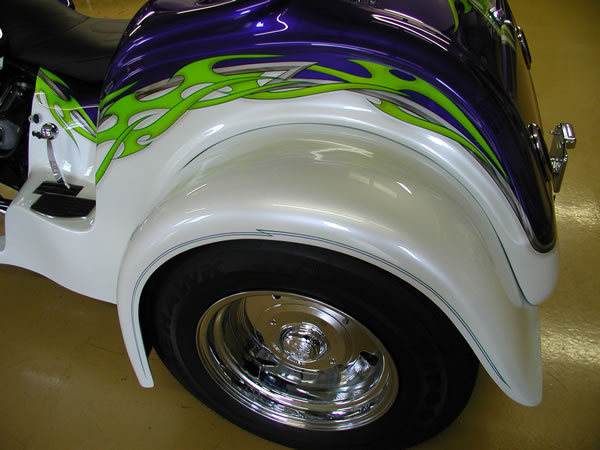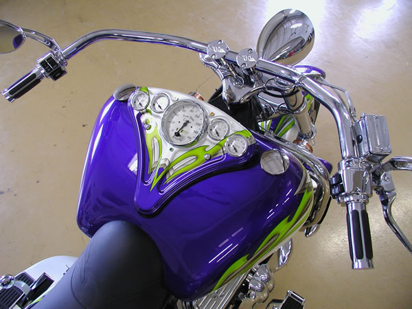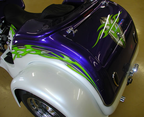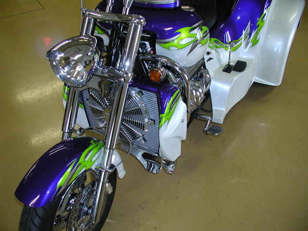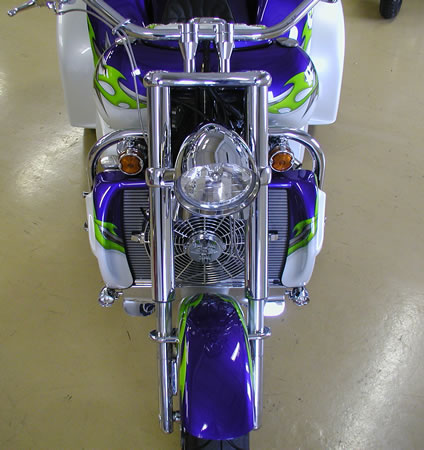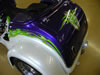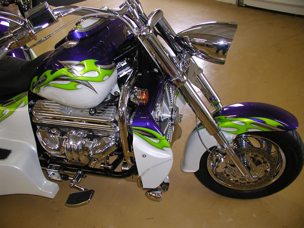 350/385 hp Hot Cam 3 Speed Auto w/Reverse, Turbo 350 Trans Pearl Diamond White & Purple with Green & Silver Custom Tribal Graphics Upper and Lower Air Dams Headwinds Headlight, Electronic Speedometer, Fuel Gauge, Lazer Driving Lights Chrome Wheels, Chrome Upper Radiator Hose 9 Gallon Fuel in Main Tank, 4 Gallon Reserve in the Rear Chrome Crash Bars, Master Cylinder Molded 3rd Brake Light, Landmark Gas Caps All The Chrome Goodies! $47,900 - SOLD |